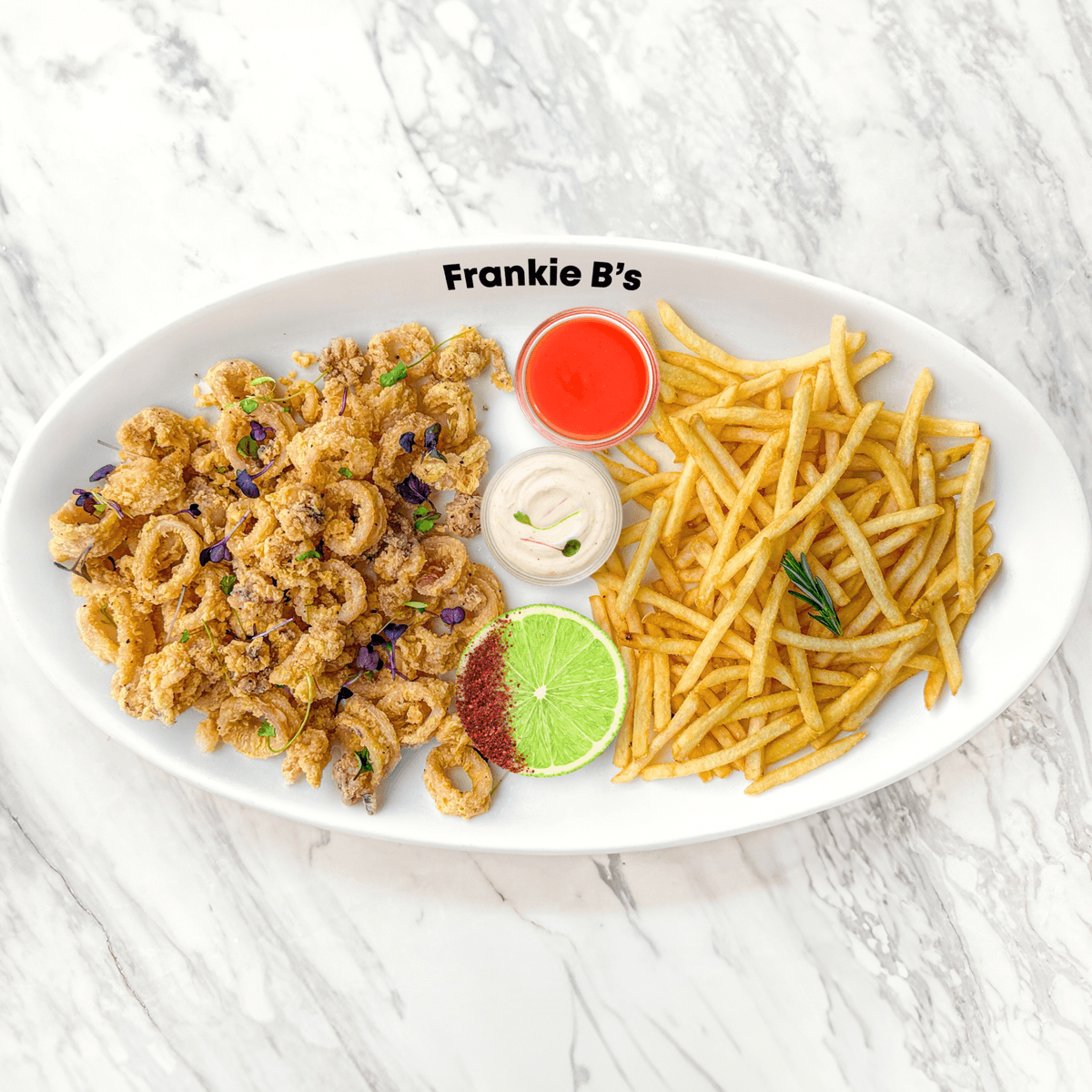 salt and pepper calamari, sumac lime, side of your choice