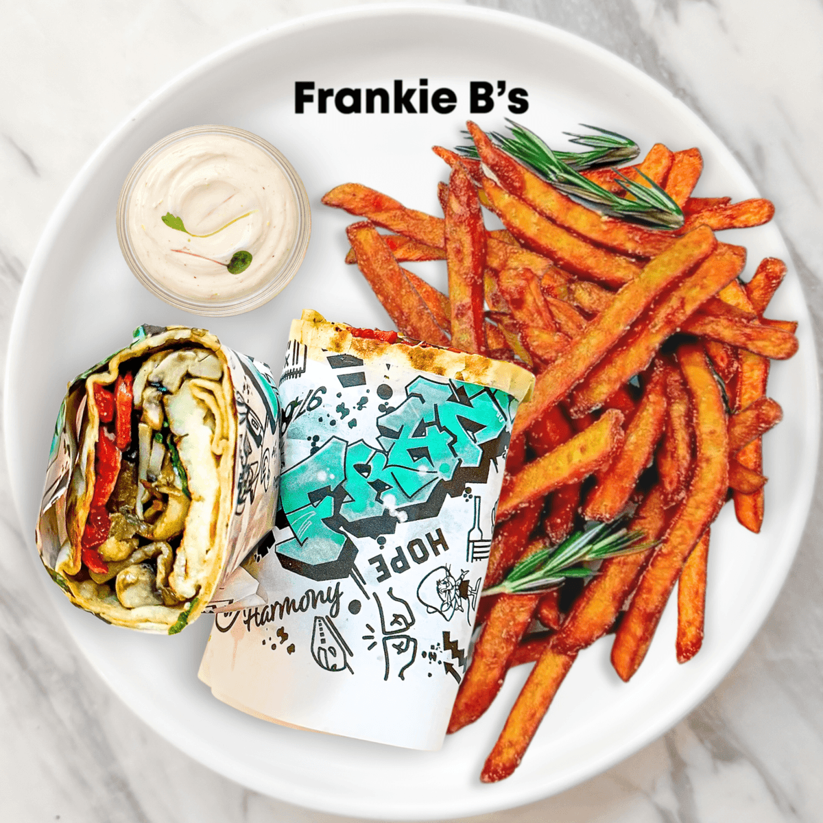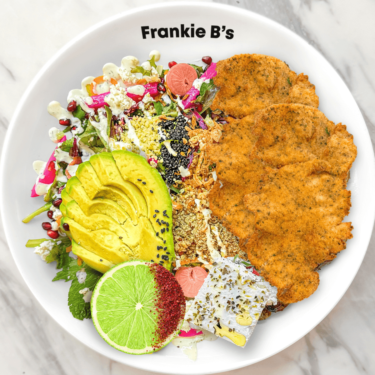 choice of your chicken, feta, turnip, fennel, cabbage, carrot, coriander, tomatoes, radish, avocado, pickled onion, pomegranate, fried shallots, almond crumble, pesto aioli drizzle, sesame, hemp, sumac lime
