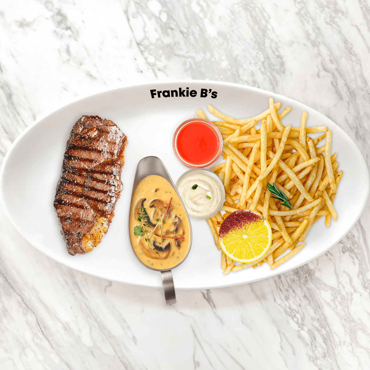 250g mb2+ sirloin, funghi sugo, side sugo of your choice, sumac lemon