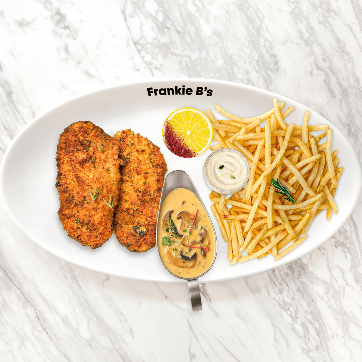 chicken cotoletta, funghi sugo, side of your choice, sumac lemon