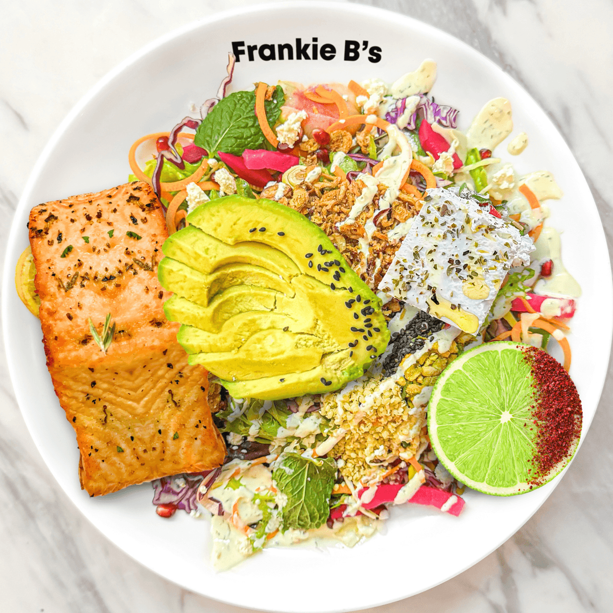 grilled salmon, feta, turnip, fennel, cabbage, carrot, coriander, tomatoes, radish, avocado, pickled onion, pomegranate, fried shallots, pistachio crumble, dill yogurt drizzle, sesame, hemp, sumac lime