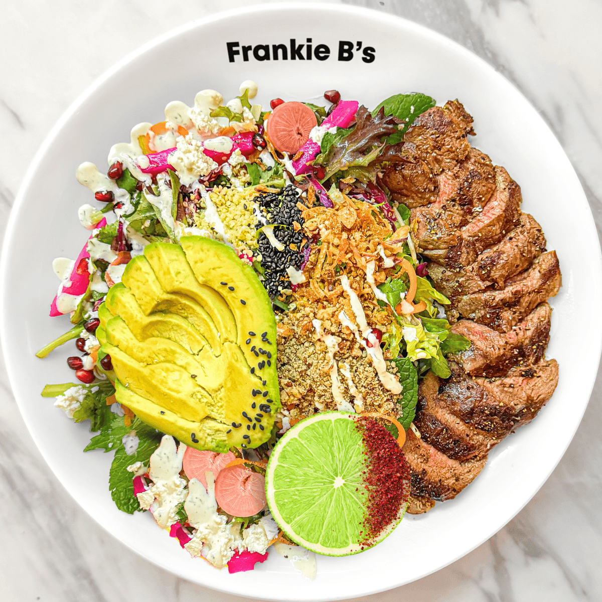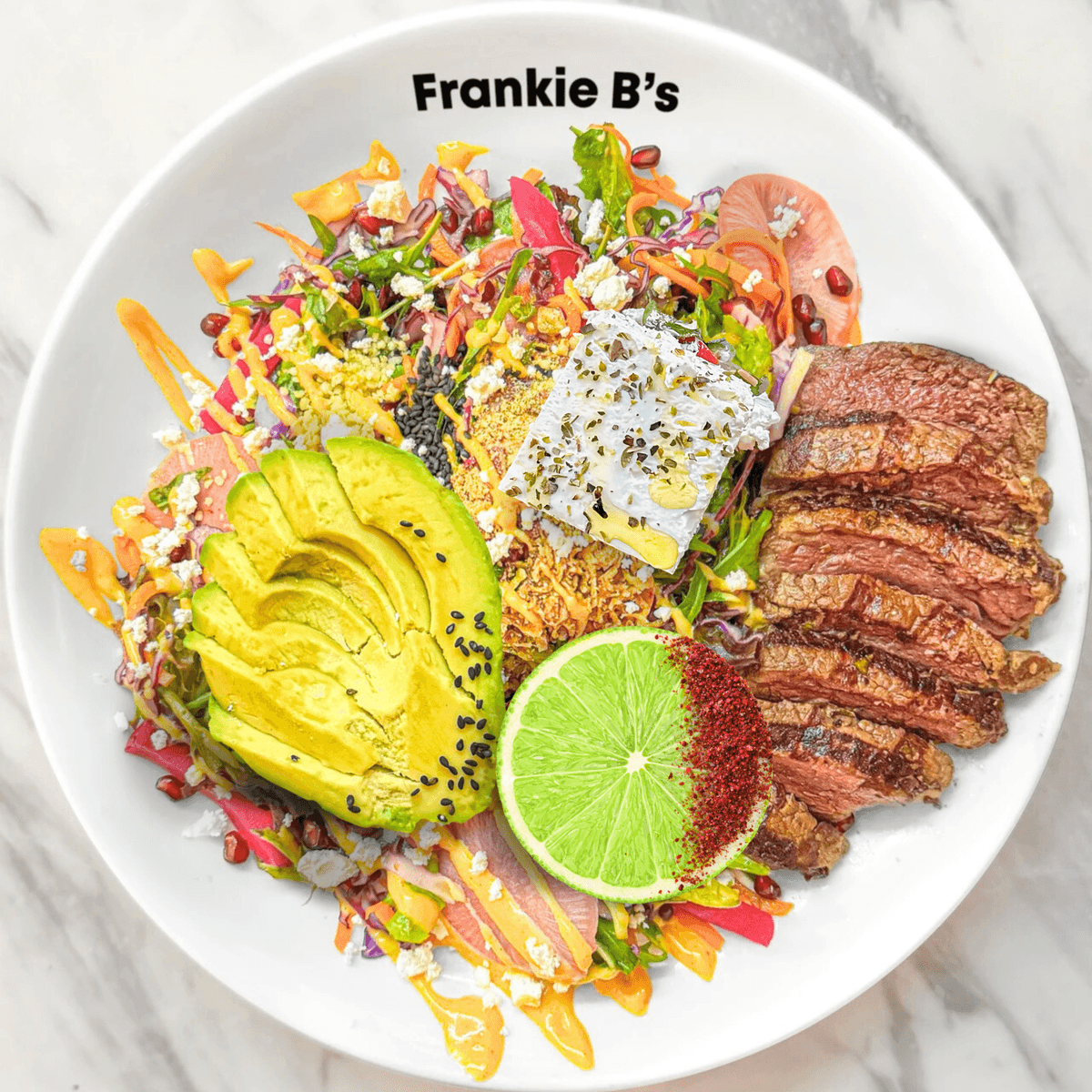 250g mb2+ msa beef sirloin, feta, turnip, fennel, cabbage, carrot, coriander, tomatoes, radish, avocado, pickled onion, pomegranate, fried shallots, pecan crumble, garlic aioli drizzle, sesame, hemp, sumac lime