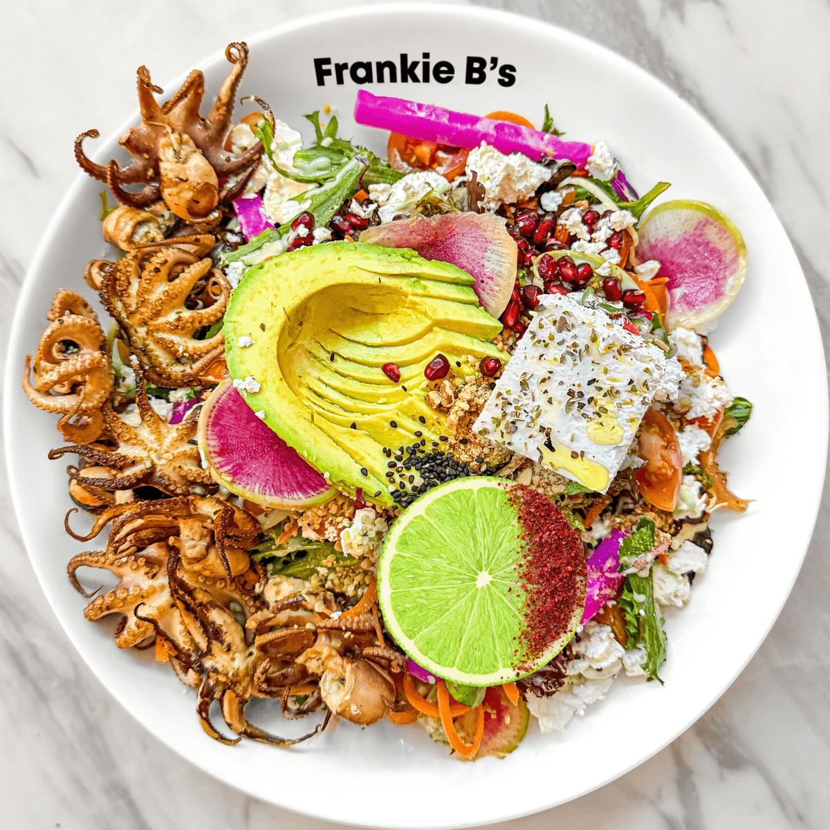 grilled octopus, feta, turnip, fennel, cabbage, carrot, coriander, tomatoes, radish, avocado, pickled onion, pomegranate, fried shallots, pecan crumble, dill yogurt drizzle, sesame, hemp, sumac lime