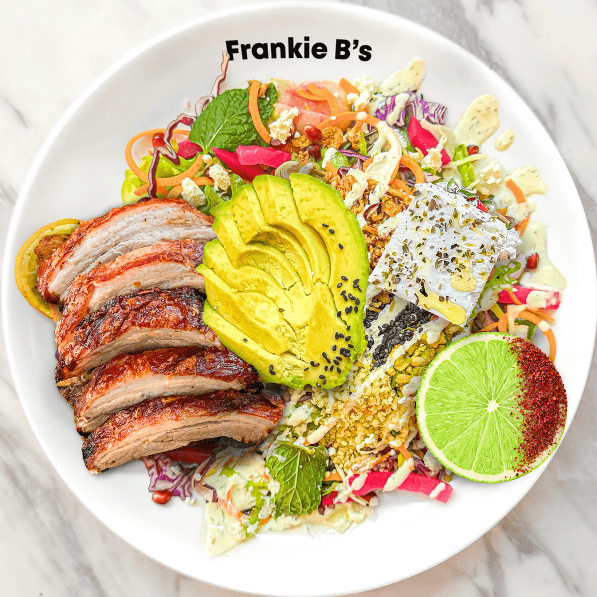 grilled lamb, feta, turnip, fennel, cabbage, carrot, coriander, tomatoes, radish, avocado, pickled onion, pomegranate, fried shallots, pistachio crumble, chilli aioli drizzle, sesame, hemp, sumac lime