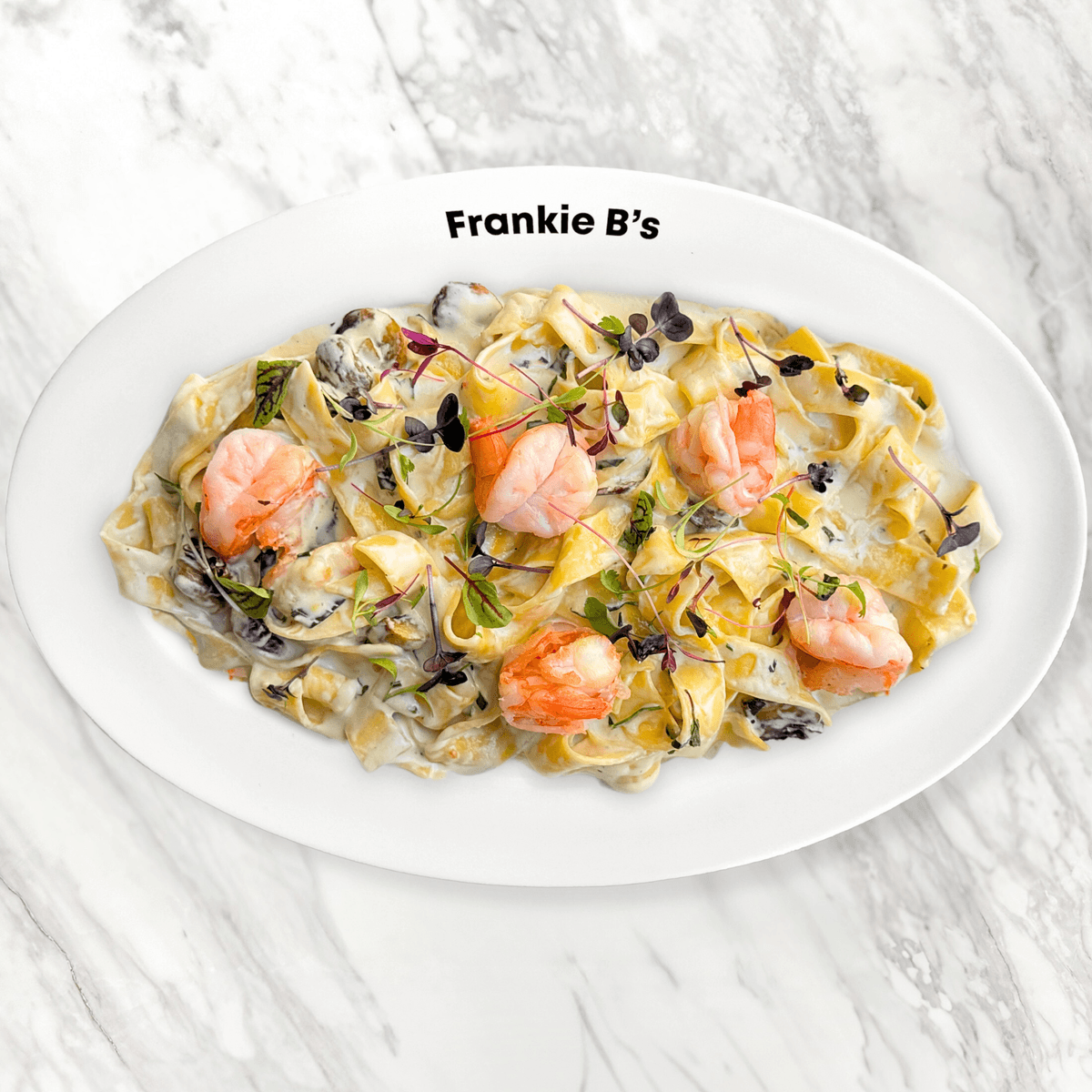 prawns, garlic, mushroom, gorgonzola, parmesan butter cream, parsley