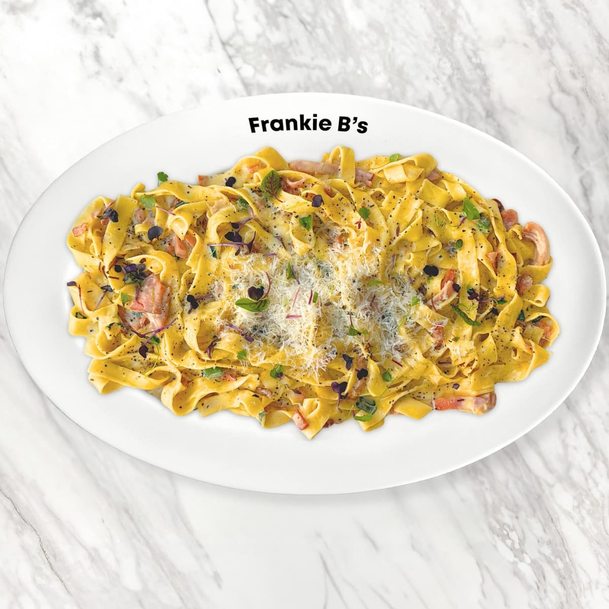 bacon, mushroom, shallots, red onion, parmesan butter cream, parsley, grated parmesan